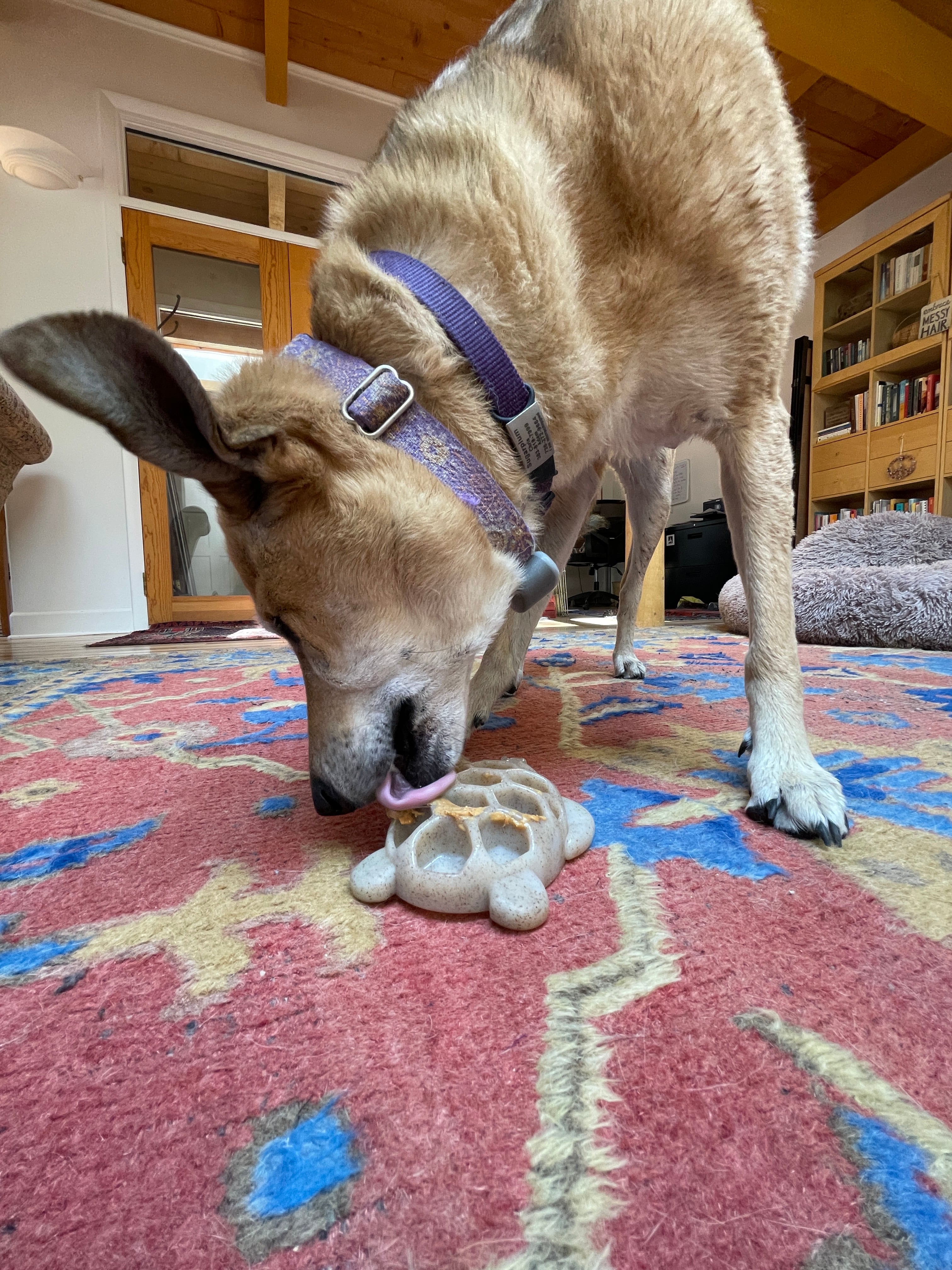 エンリッチメントを考えたデザインになっており、おやつもぬれるようになってます。ウェットフードや柔らかい食べ物を表面に塗り、ワンちゃんに遊ばせてください。