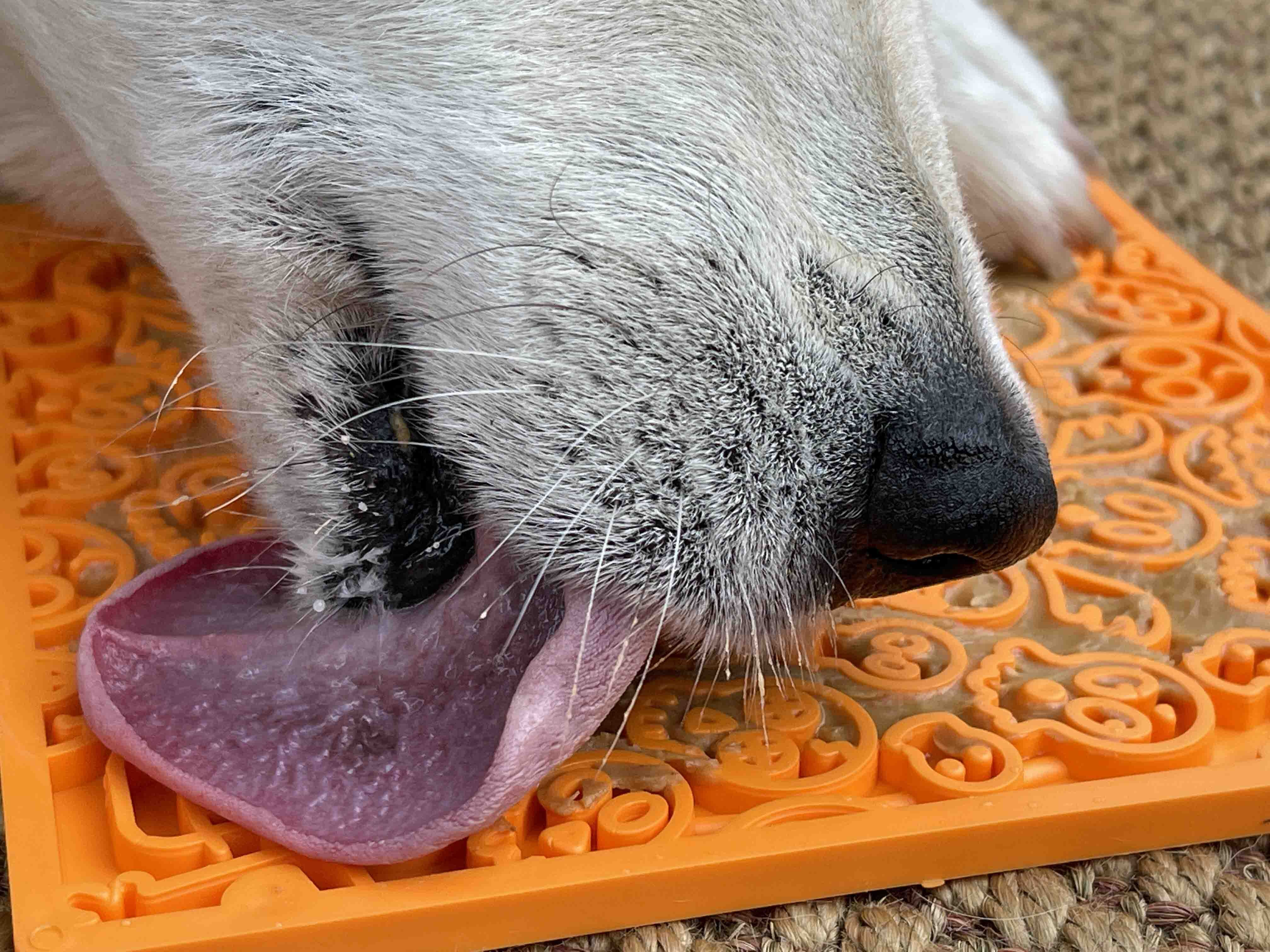 舐めることでワンちゃんは落ち着くことができます。お気に入りの柔らかいおやつをマットの表面全体に広げ、おやつがマットの表面に押し込まれるように塗ります。