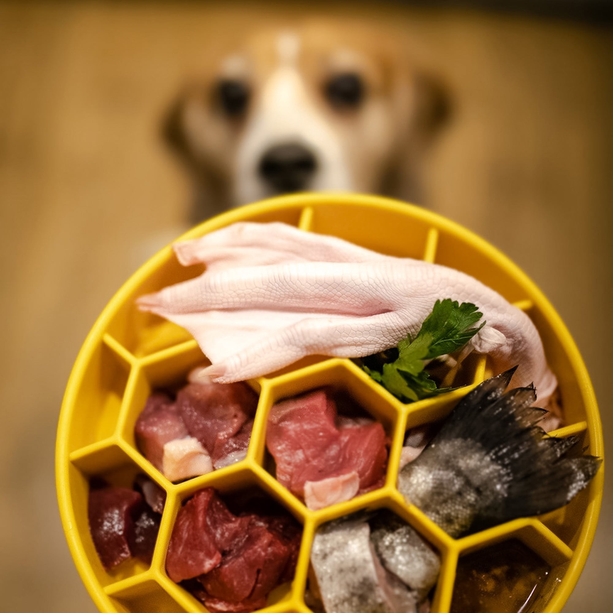ハチの巣フードボウルは、ウェットフードとドライフードを一緒に提供するのにぴったりなデザインです。沢山の仕切りでウェットフードトドライフードを混ぜたり、別々にしたり盛り付けが楽しめる早食い防止トレイです。深さのあるフードボウル生食にもおすすめです! (生食を始める前には必ず獣医師に相談してください)。ハチの巣はおやつにも食事にも使えます。